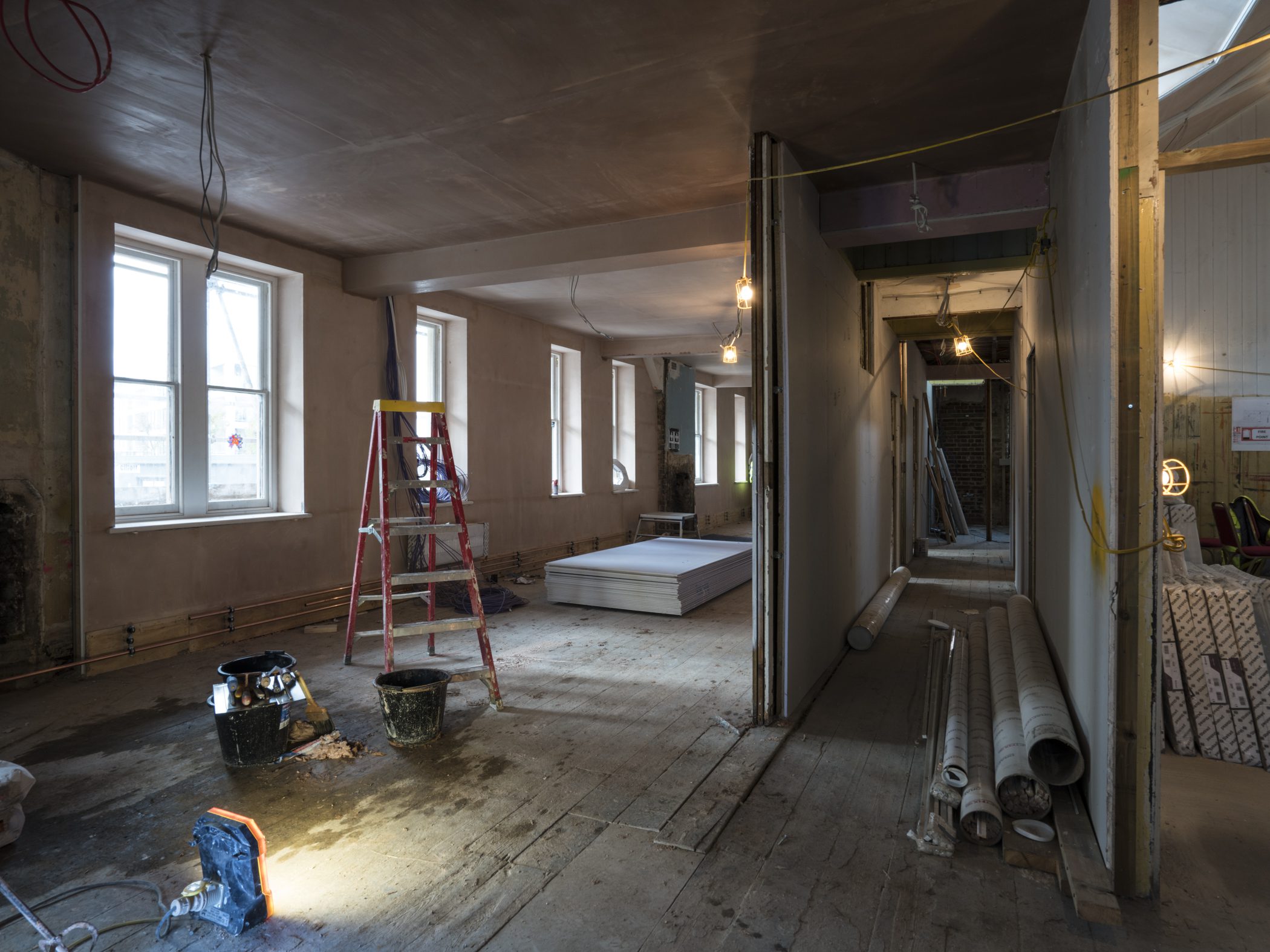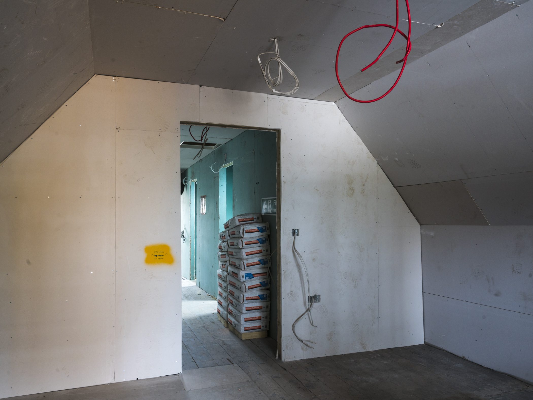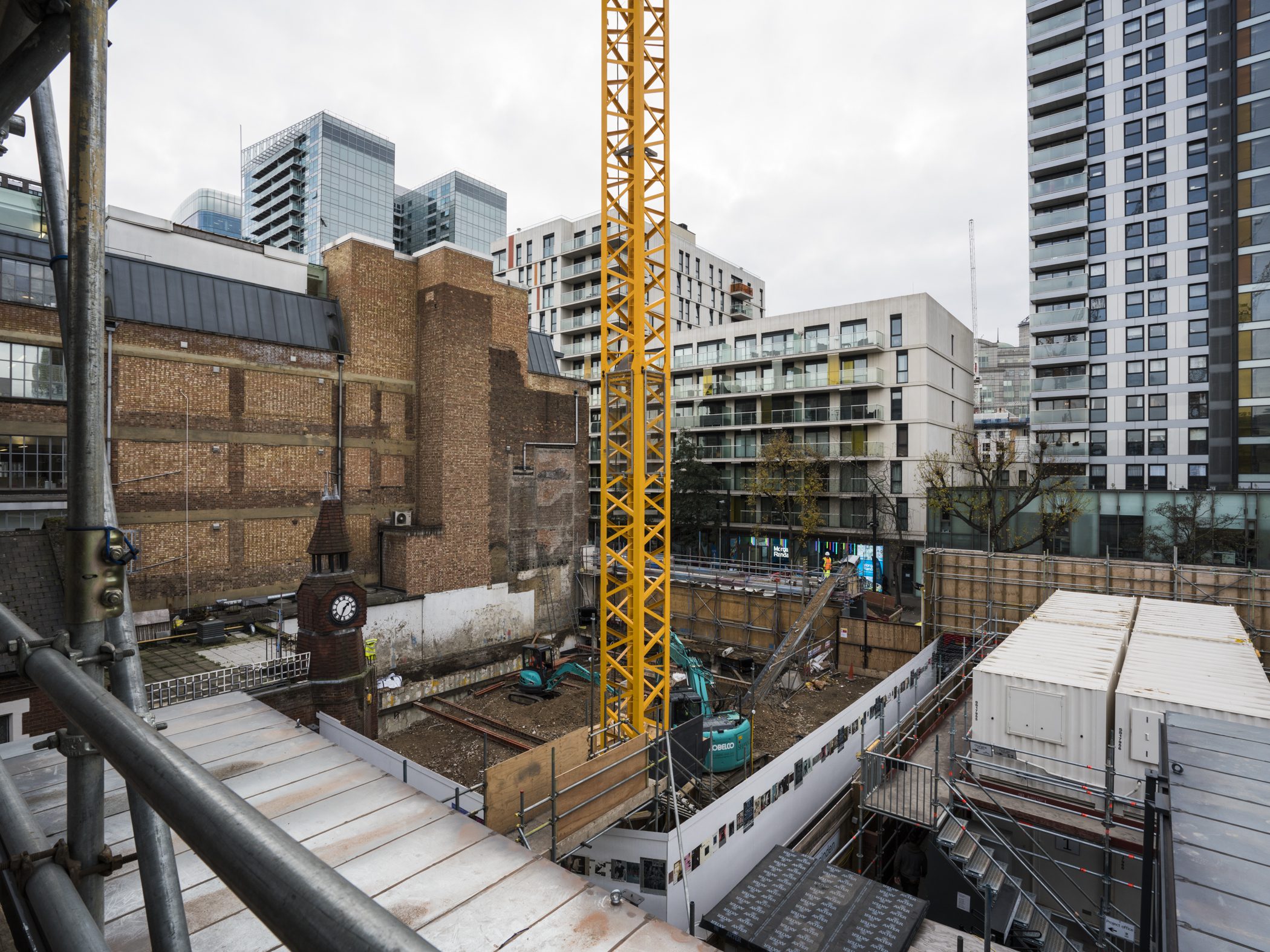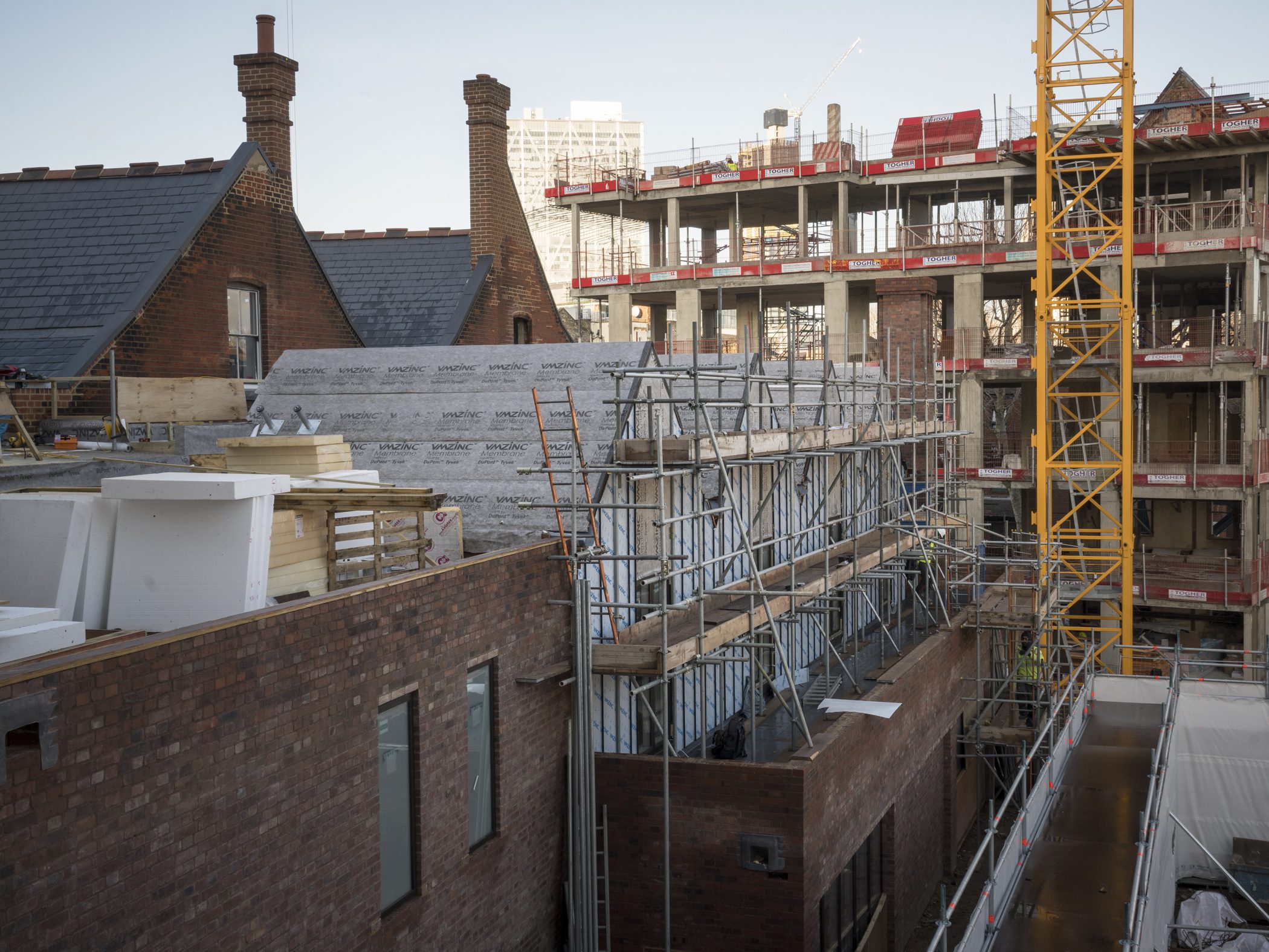 I have made two visits to Toynbee Hall in recent weeks and it was wonderful to see the work continuing to progress and to meet new Chief Executive Jim Minton. The canopy covering the old hall has now been removed and the new roof is in place. Profumo House has been demolished opening up the frontage. And all around stand yellow cranes. At the rear, the new extension with its four gable roofs has taken shape. How wonderful it will be to see these roofs clothed in zinc! Inside, rooms are full of the materials needed for finishing; wall panels, bags of plaster, wiring loops and much more. New paneling and plastering are all around. Things are really taking shape.